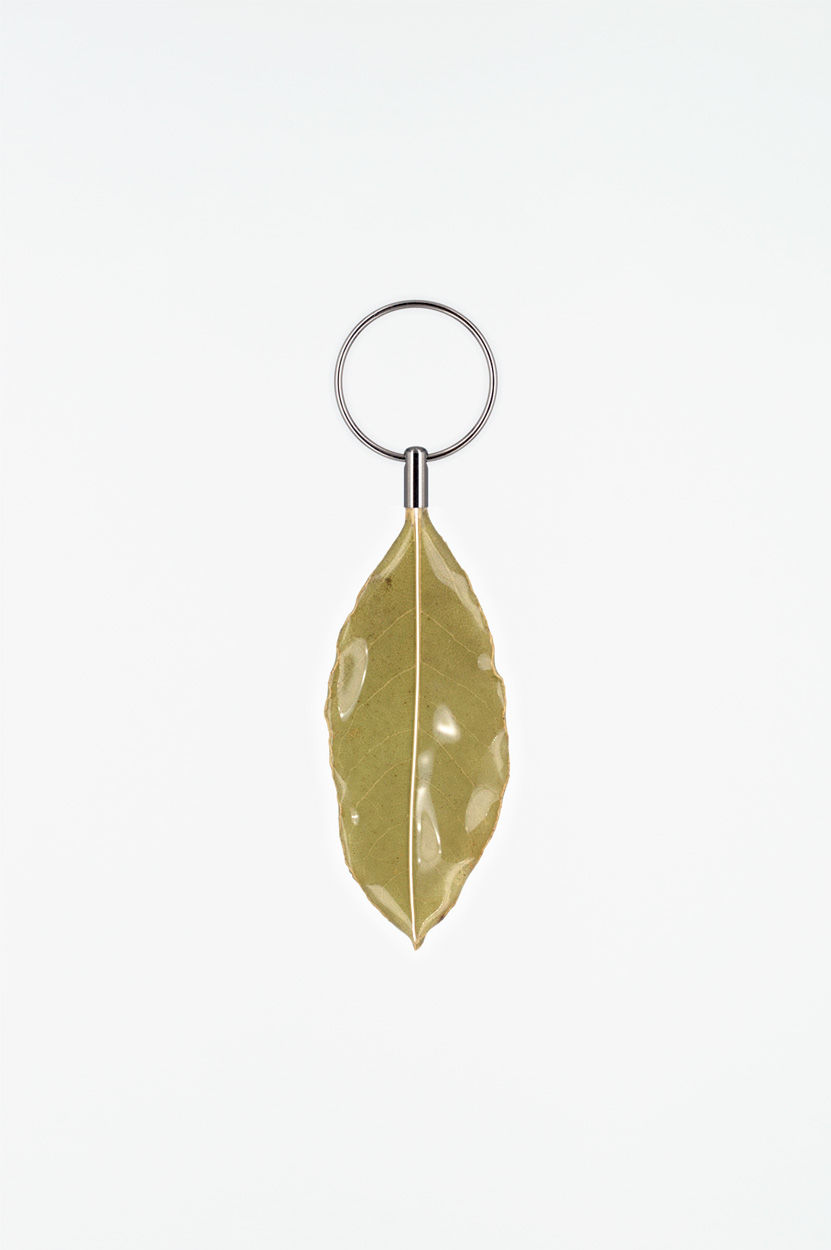 The leaf is naturally dried and moulded to maintain its three-dimensional, organic shape. Carefully preserved by hand in several layers of non-toxic resin, the piece is adorned with a silver wire applied along its backside and finished with an end cap as well as a split ring made of stainless steel. This allows the pendant to be worn on chain or belt loops, zipper pulls, necklaces and much more.