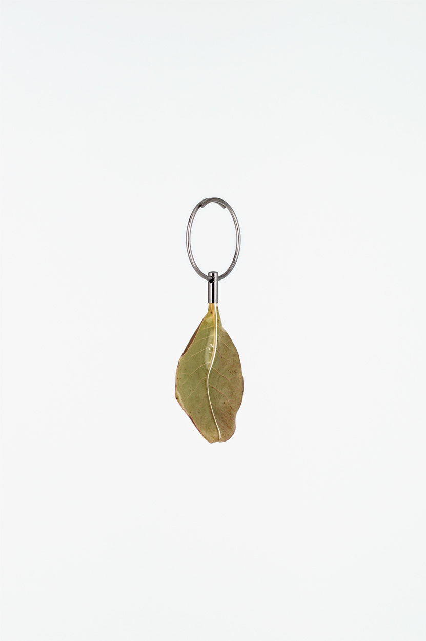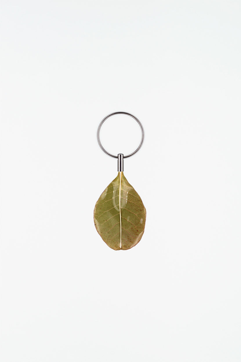 The leaf is naturally dried and moulded to maintain its three-dimensional, organic shape. Carefully preserved by hand in several layers of non-toxic resin, the piece is adorned with a silver wire applied along its backside and finished with an end cap as well as a split ring made of stainless steel. This allows the pendant to be worn on chain or belt loops, zipper pulls, necklaces and much more.